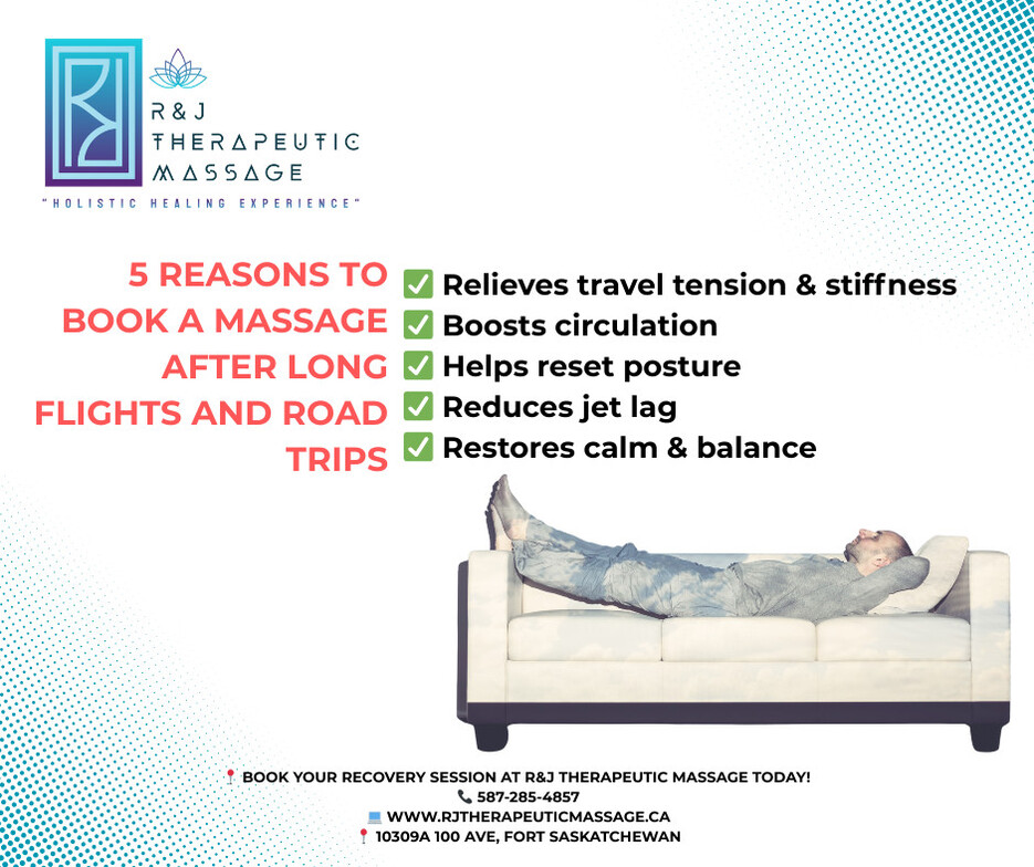 Have you ever noticed puffy feet or heavy legs after a long trip? That’s poor circulation from being still too long. Massage helps improve blood flow and lymphatic drainage, reducing swelling and restoring energy to tired limbs.